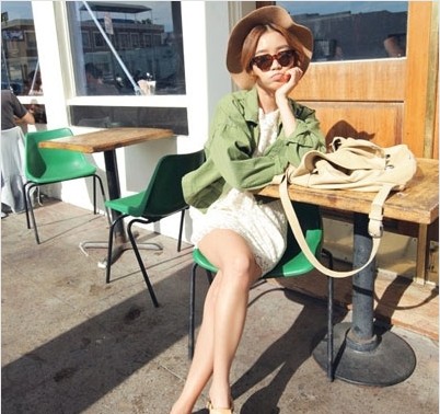 與上一款的女士太陽帽相比,這款禮帽類戶外空頂帽則要顯得高貴的多,加上軍綠色夾克,搭配白色蕾絲連衣裙,休閑中不是女王氣質(zhì)。