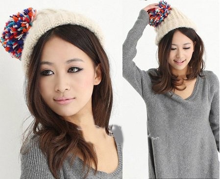 彩色毛球粗棒針針織帽x栗色中長卷發(fā)