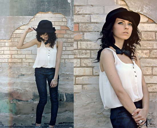 略顯透視的白色背心T搭配暗花修身褲,酷味十足。頸間的黑色蝴蝶結(jié)與同色系復(fù)古小禮帽的搭配,更是為整體裝扮增添了一絲趣味兒,看似中性的元素卻迸發(fā)出了無限可愛感。