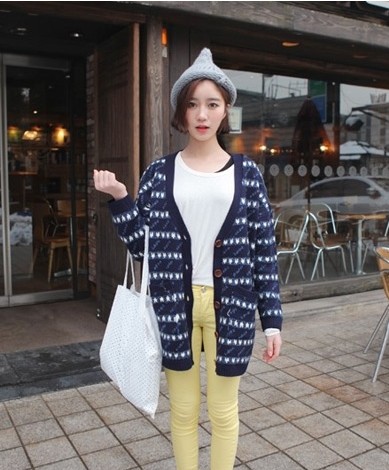 灰色梨形針織帽&藏青色毛衣外套&糖果色緊褲整體服飾搭配風(fēng)格比較休閑個(gè)性風(fēng),毛衣外套是春季的基本款服飾,內(nèi)搭淺色tee,下穿鵝黃色緊身褲,超級(jí)清新風(fēng)的街頭裝扮