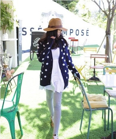 暖春的時(shí)候,如何裝扮自己最有氣質(zhì)呢?頭頂一款褐色平沿帽,藏青色波點(diǎn)圖案毛衣外套,配上白色連衣裙,就很清純、秀氣。特別適合內(nèi)向派美眉們的春季出行搭配哦!