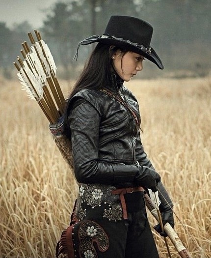 一身全黑的裝扮,手冷兵器箭,犀利的眼神中充滿著殺氣,頭上的這款西部牛仔帽,更突顯了帥氣的俠女形象。就這樣一位抗日女俠形象,就這么深深的留在觀眾的心中了.