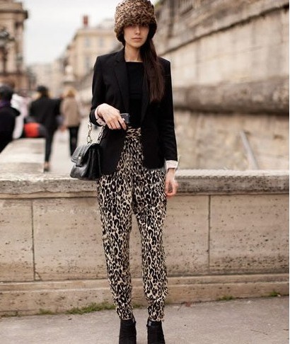 2011年的T臺上開始大肆流行動物的圖案,豹紋作為經(jīng)久不衰的元素,被無數(shù)人傳唱出美麗的傳說,這位街拍達人可以說是十足的豹紋控!簡約的黑色西裝如果沒有豹紋哈倫褲的襯托,一定是沉悶且毫無生氣的,不甘寂寞的豹紋元素又出現(xiàn)在帽子上,簡潔緊實的設(shè)計,令模特的頭部造型看起來十分的精致大方,模特在兩個單品上同時選擇豹紋,卻沒有感到一絲的凌亂和眩暈,利用黑色將其分層,更感覺層次之間的遞進落落有致。