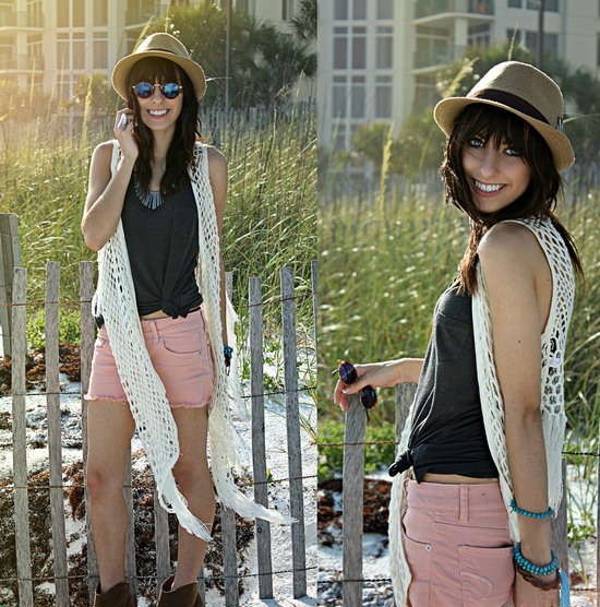不羈的裝扮在編織小草帽的襯托下顯得額外自然、休閑。粉色系的牛仔熱褲又在這份不羈中增添了些許的甜蜜感。