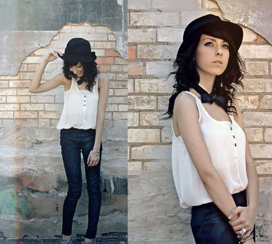 略顯透視的白色背心T搭配暗花修身褲,酷味十足。頸間的黑色蝴蝶結(jié)與同色系小禮帽的搭配更是為整體裝扮增添了一絲趣味兒,看似中性的元素卻迸發(fā)出了無限可愛感。