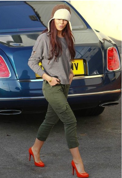 里爾-科爾改良雷鋒帽很高調(diào),針織衫配7分格斗褲橘色高跟鞋吸睛。 m.hzyichun.com 帽子工廠