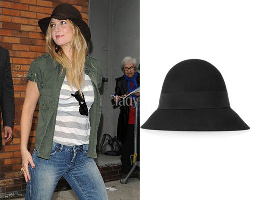 Drew arrymore黑色的帽沿輕輕垂落,低調(diào)高雅。即便搭配簡單的條紋T恤和軍綠色襯衫,也潮流指數(shù)飆升,讓人感覺親切舒適。搭配淺色系的發(fā)色能使造型更為出色。
