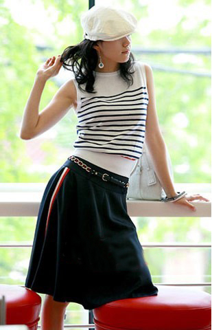 03 黑白條色經(jīng)典裝扮給黑色貝雷帽以完美的色彩氛圍,充分展現(xiàn)女性的柔媚
