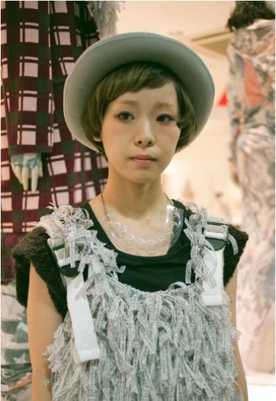 復(fù)古又帶點個性的寬檐圓頂帽搭配不規(guī)則修剪的短發(fā),加上淺灰色挑染的發(fā)色,趣味十足。